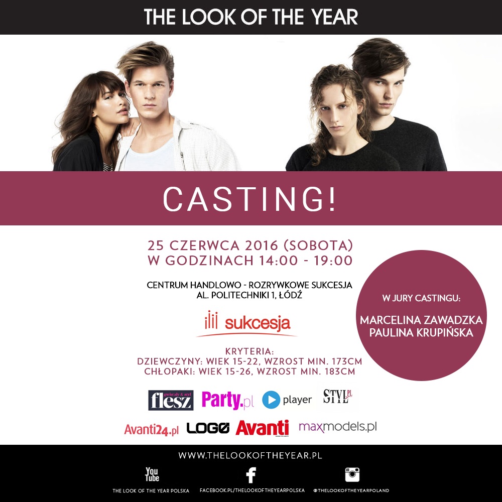 Ważne informacje dla uczestników castingu! Na sobotni casting mogą zgłaszać się dziewczyny w wieku od 15 do 22 lat, mające minimum 173 cm wzrostu oraz panowie w wieku od 15 do 26 lat o wzroście minimum 183 cm. Osoby niepełnoletnie muszą przyjść na casting z opiekunem, udział w castingu jest bezpłatny. Więcej informacji na www.thelookoftheyear.pl